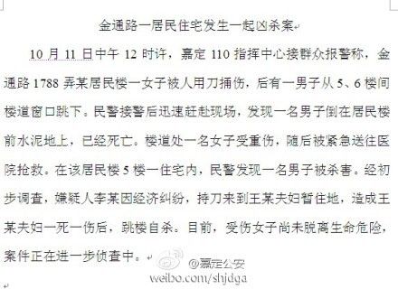【新民网·独家报道】今天(10月11日)中午12时许,嘉定区金通路1788弄内一男子从住宅楼高坠身亡,警方赶到后发现楼道内有一名受伤女子,5楼一户家中有一名男子已经死亡。据嘉定警方官方微博披露,初步调查系嫌疑人李某因经济纠纷,杀死、捅伤一对王姓夫妻后从居民楼高处跳下自杀,目前警方仍在进行调查。