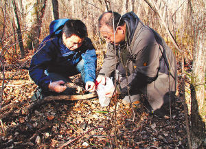 10月6日,饶河县境内宝马山林场工人历保卫,陪同省第一森林调查规划设计院研究员到林场考察时,一脚踩上了一块“不明物体”,仔细一看,居然是连着猪嘴的半张野猪头。随后他清理现场,发现此处“埋”有一具野猪尸体残骸,回到场部后,他立即向迎春林业局东北虎监测站站长董红雨汇报。