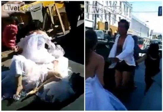 据台湾东森新闻云网站消息,智利有一段视频描述“2名新娘同一时间嫁给1男子”,只见穿婚纱的2名女子在街上互殴,其中一名的礼服还掉了下来,而疑似“祸根”的新郎仅穿着一条内裤,场面非常混乱。