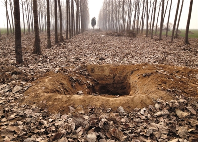 12月19日,半坡店村东的杨树林里,村民说,警方曾从这个坑里挖出一具尸体。新京报记者大路摄