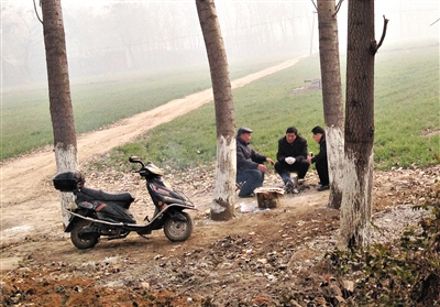 12月19日,三男子烤着火守住通往禹州半坡店村的路口,以防陌生人进村。李占峰等6人,一年内陆续杀死9人,埋于自家院子及村子周边。 新京报记者大路摄