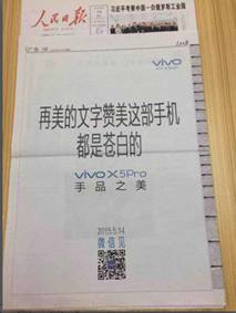 有耐心的读者翻到报纸底版会发现,一句“再美的文字赞美这部手机都是苍白的,vivo X5Pro手品之美,5.14微信见”跃然纸上。至此谜底揭晓,其实这是知名手机厂商vivo投放的一则创意广告,意在为新机X5Pro上市造势。