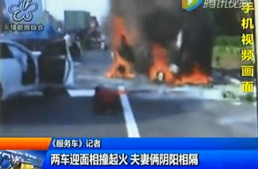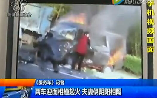 据目击者称,事故发生时,丈夫将妻子使劲推出了车外,自己没能及时逃脱。 (来自:无锡电视台)