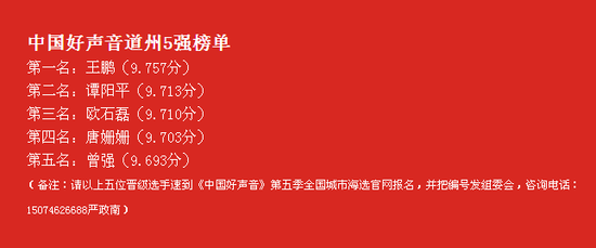 5月21日22:00,由灿星制作、腾扬广告主办,道州五金建材物流园冠名,腾讯房产永州站承办,永州网、永州微生活、开门红文化传播演艺有限公司协办的第五季中国好声音城市海选道州赛区,在道州火车站圆满落幕!历经为期28天的线上投票和两场线下地面选拔,道州赛区的五强选手也终于揭晓啦!他们是:王鹏、谭阳平、欧石磊、唐姗姗、曾强。