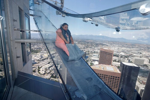 在美国洛杉矶市联邦银行大厦(U.S.Bank Tower)的建筑外围,有一个特殊的滑梯。这个滑梯名叫“天空滑梯(Skyslide)”,建在联邦银行大厦的外立面,由金属框架固定和支撑,位于这座摩天大楼的69到70层处,大概距离地面300米。