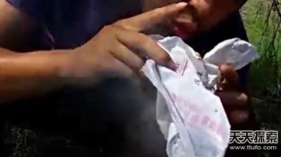 然后男子拿一些纸裹住黑布,轻轻的吹。烟开始越来越浓。