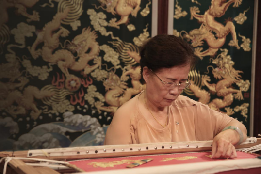 此次康惠芳大师带来的“金禧良缘”金线嫁衣,采用了潮绣最具特色的“垫高立体”的绣法与高纯度真金线结合,让嫁衣色彩凸出,让线条更自然美观。康惠芳大师表示,为了更好的展现一对新人至纯至真的情感,嫁衣刺绣在材料方面也有了很大的一个创新突破,本次刺绣除了大部分用含金量94.0%和含金量96.78%的真金线来刺绣外,还运用了足金999.99的最高纯度的金丝来刺绣所有龙的龙须部分,缔造出大气奢华的婚嫁喜服,完美诠释了最纯的黄金与最纯的爱情的结合。在创作“金禧良缘”嫁衣的过程中,康惠芳大师还亲至德诚集团,亲眼见证了黄金创作的匠人们专注工艺、精益求精的一面。匠人们的一举一动牵动着康惠芳大师的内心,希望通过此次跨界创新合作赋予潮绣更多的新鲜感和时尚元素的同时,也让潮绣文化通过婚嫁囍事的方式不断传承,传达出匠人匠心之美。