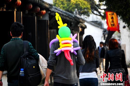 4月1日,一名男子背着一个色彩鲜艳、形似蜜蜂的气球玩偶行走在古色古香的江苏苏州平江路历史街区,走到哪都吸引过往人们好奇的目光。吴瞳 摄