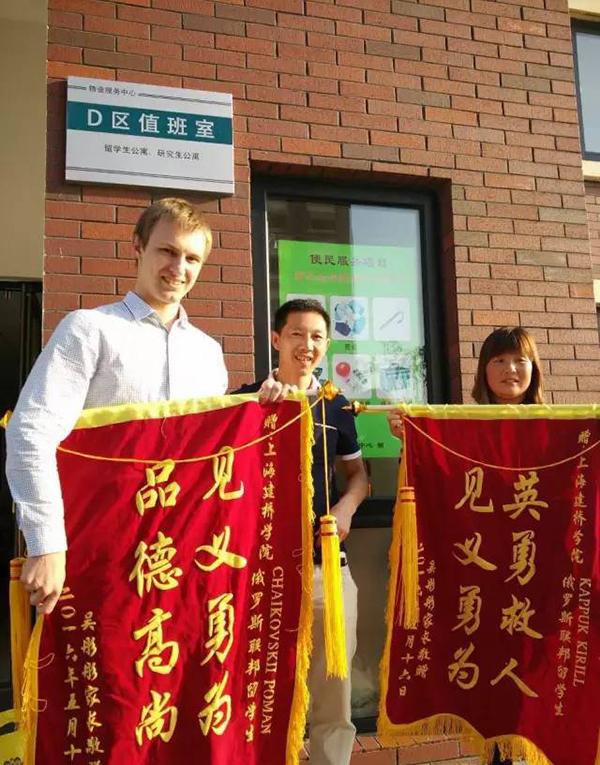 5月16日下午,上海奉贤区的胡先生和妻子来到临港大学城上海建桥学院国际设计学院,送上锦旗,感谢该校俄罗斯留学生Roman、Kirill,法国外教Bastien救了他们的17岁女儿。