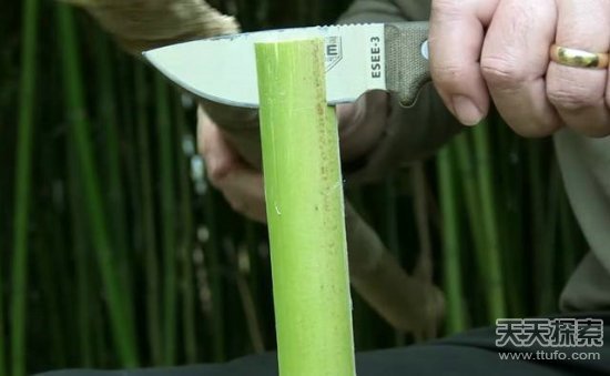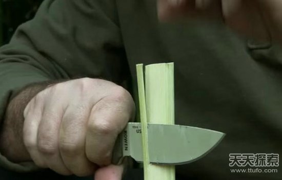 接着,他用军刀在竹片的边上斜着切了一刀,这样被切的这一面就会出现类似刀锋的形状。