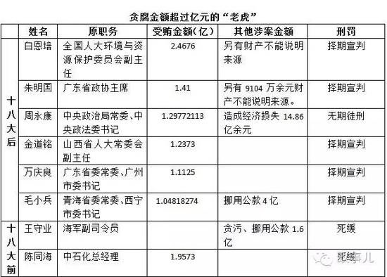 “政事儿”不完全统计,改革开放后至十八大之前落马的省部级级以上官员中,贪腐金额过亿的官员不多,中石化原老总陈同海(受贿金额1.9573亿)、海军原司令员王守业(贪污、挪用公款1.6亿)等。两人均被判处死缓。