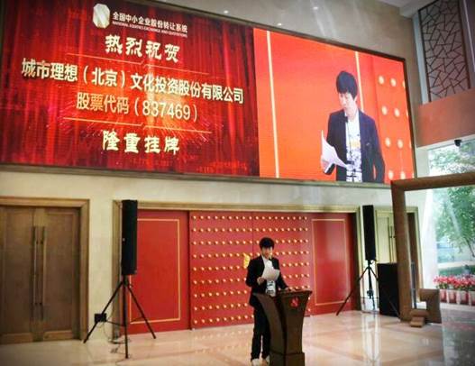 2016年7月26日,音乐类服务平台城市理想(北京)文化投资股份有限公司(股票代码为837469)在北京全国中小企业股份转让中心隆重举行新三板挂牌敲钟仪式。城市理想董事长解晓东、CEO吴梓仪以及理想团队成员出席了这次仪式。