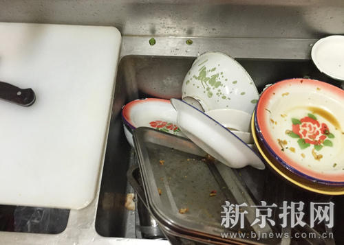 2016年7月5日,朝阳区北京像素小区,望京小腰麻辣面。池子里堆满待洗餐具,这里面也用来洗菜和涮拖把。