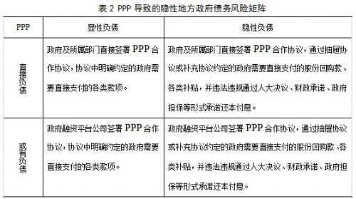 在多方面因素的综合作用下,地方政府从一开始推出PPP,实际采用的就是完全政府付费模式,社会资本不实际参与公益性项目的论证、设计、建设和运营,仅仅向地方政府提供资金,地方政府承诺通过回购股份、支付固定收益等方式承担还本付息责任,从而形成了隐性地方政府债务。依据世界银行专家汉娜提出的用于地方政府债务分析的财政风险矩阵对PPP导致的隐性地方债务分类情况见表2。