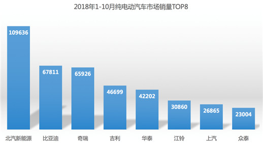 2018年1-10月纯电动汽车市场销量TOP8(数据来源:乘联会)
