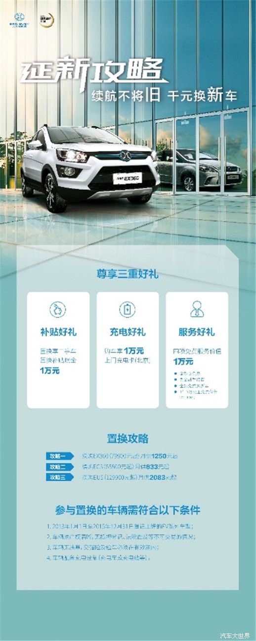 作为纯电动汽车领航者,北汽新能源不仅致力于为用户带来绿色、便捷的出行体验,更以高度的社会责任感,为广大老用户的体验升级保驾护航。近期,北汽新能源面向2013-2015年购买EV系列车型的老车主推出了置换政策,参与置换购车的EV车主,选购EC系列、EX360 、以及EU5三款车型,可获得“3万元置换礼包”,包括价值1万元的现金置换补贴;价值1万元的免息定额贷、免金融手续费、免费全损换新车、免费3年3万公里保养等4项免费服务;北京市的EV车主,还可享受价值1万元的上门充电服务。富有诚意的置换政策,一定程度上助力了北汽新能源销量的持续走强。