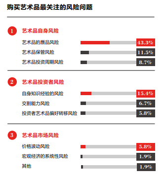 艺术品自身风险 :艺术品赝品风险 艺术品的真伪性是每个投资者及收藏家都会遇到的难 题。随着技术的发展 , 造假技艺越来越精湛 , 加剧了分辨真 伪的难度,在很多鉴定问题上留有争议。本次研究发现,艺术品赝品风险的问题,仍是投资者在购买艺术品时最主要关注的问题,占了 43.3%。在现代充满赝品的艺术市场中, 若投资者在没有深入研究或请专业人士鉴定的前提下贸然买进,将有可能需要承受巨大的风险,更不用说保值增值了。
