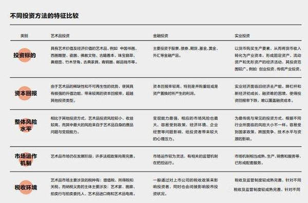 艺术品投资的特征相较于金融投资和实业投资,艺术品投资标的是具有艺术价值及经济价值的艺术品,例如 :中国书画、西画雕塑、 瓷器、佛教文物、古籍善本、珠宝翡翠、鼻烟壶、竹木牙 角、古典家具、青铜器、邮品钱币等。艺术品凭借其稀缺性 和升值保值的特征,在资本回报率上具有较高的优势 ;从 整体风险水平来看,艺术品投资的风险主要来自于艺术品自 身的赝品问题 ;在市场运作机制与税收环境层面,艺术品投资仍处于发展阶段,需更进一步的完善。