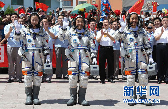 问天阁外,送行的人们鼓掌欢呼。3名航天员列队请示出征。随着载人航天工程总指挥张又侠一声“出发”的命令,航天员们向送行的人群挥手致意,登车前往发射场,进入飞船做最后的准备。