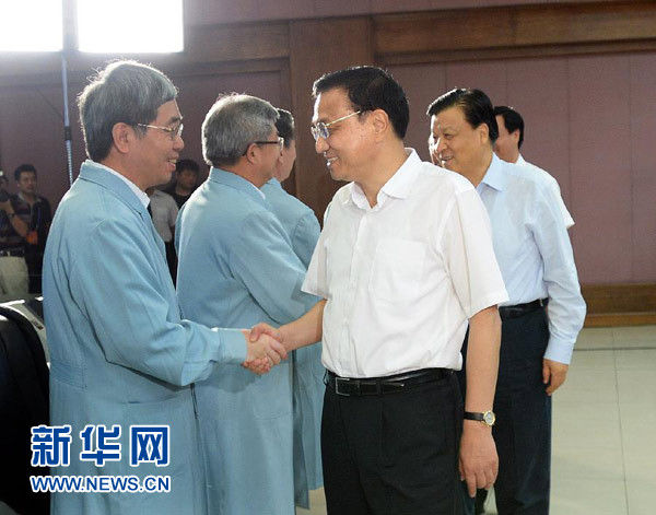 6月11日,中共中央政治局常委、国务院总理李克强,中共中央政治局常委、中央书记处书记刘云山在北京航天飞行控制中心观看神舟十号飞船发射实况。这是神舟十号飞船发射成功后,李克强、刘云山与北京航天飞行控制中心的工作人员握手交谈。 新华社记者李涛摄