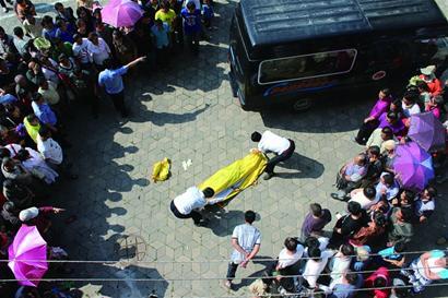 记者闻讯赶到现场时,120救护车停在楼下,急救人员为躺在居民楼下的母子俩反复检验,但始终找不到一点生命的迹象。记者看到这名女青年看起来只有20多岁,穿着浅色上衣和牛仔裤,一只红色的平底鞋甩在她身边。她身上几乎看不到一丝血迹。在她的右手边不远处,躺着一名小小的婴儿,那是她的亲生儿子。旁边摆摊卖西瓜的商贩,楼里的居民们都听到很响的“轰”一声,还有人听到了一名女青年的尖叫。