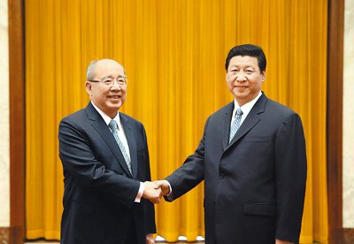 6月13日,中共中央总书记习近平在北京人民大会堂会见中国国民党荣誉主席吴伯雄。新华社记者 兰红光摄