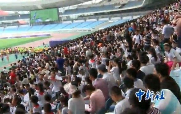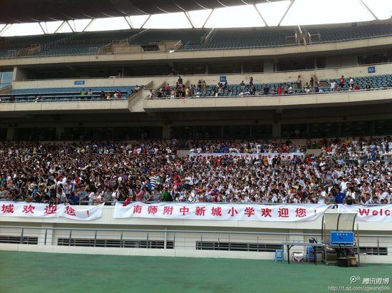 今天南京天气非常炎热,只要稍稍离开空调房,就是一身汗。差不多中午2点左右,记者在奥体二层平台看到,一大群小学生在老师的带领下进入奥体二层看台,整整坐满了3个看台。粗略看一下这些小朋友,他们的年龄也就是在10岁上下。应该说,这个年龄段的小朋友,关注足球不多,更难言是小贝的球迷了。