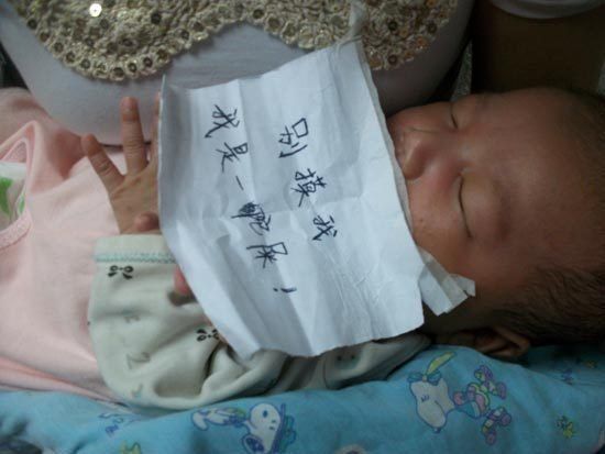 出现这一情况,家属的情绪很激动,由于双方分歧很大,事件近一个月都无法达成一致。正在纠纷处理过程中,7月4日中午12时,唐女士去看望躺在市妇幼保健院8楼病房的皓皓。眼前的一幕让她惊呆了,皓皓的脸上用两块透明胶带贴上了一张纸条,上面写着:“别摸我,我是一坨屎”。她无法接受孩子遭受这样的侮辱,心疼得眼泪直流。