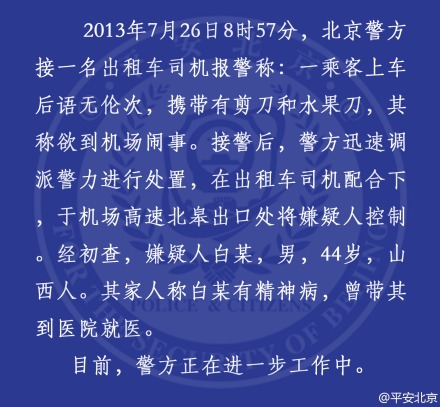 人民网北京7月26日电(赵艳红)北京警方今日下午对外披露:今日8时57分,北京警方接一名出租车司机报警称:一乘客上车后语无伦次,携带有剪刀和水果刀,其称欲到机场闹事。接警后,警方迅速调派警力进行处置,在出租车司机的配合下,于机场高速北皋出口将嫌疑人控制。经初查,嫌疑人白某,男,44岁,山西人。其家人称其有精神病史,曾带其到医院就医。