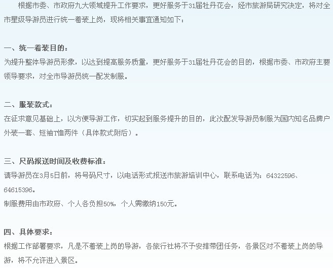 洛阳旅游咨询培训服务中心:关于对全市注册导游员统一服装的通知(网络截图)
