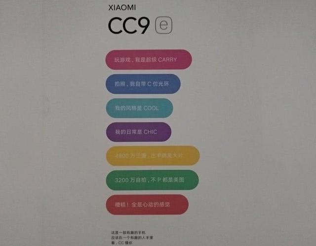 此外,在曝光的小米CC9和小米CC9e的图片中有“我的风格是COOL”“我的日常是CHIC”的卖点,可以推测,该新机的定位与拍照算法将会更加迎合年轻消费群体。并且,图片中还有“玩游戏,我是超级CARRY”字样,所以该机很有可能针对一些主流游戏做出优化,或推出专业的游戏模式,提升用户的游戏体验。最后末尾还有一行小字标注“这是一部有趣的手机,应该放在一个有趣的人手里,看,CC懂你”,可知小米CC9 e应该会有更多有特色的卖点。