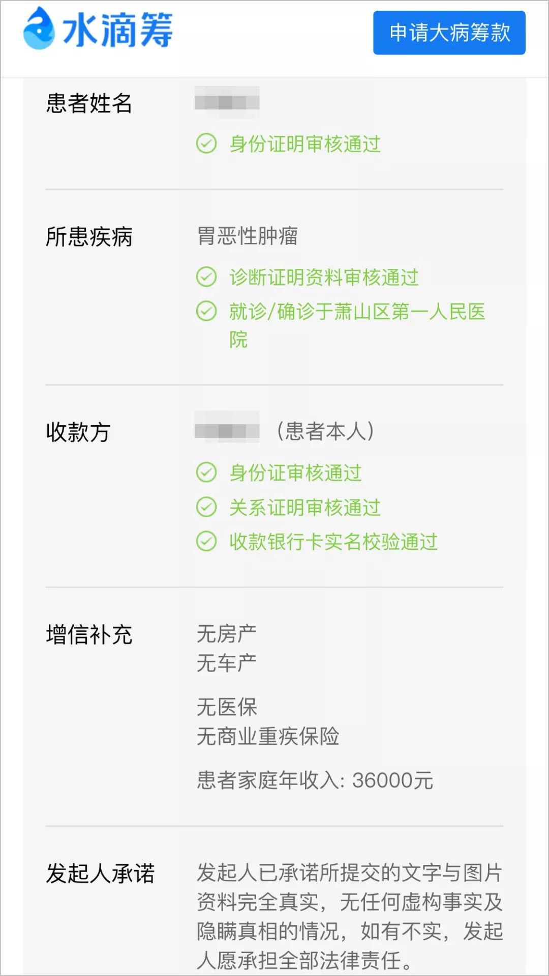 一个月前,杭州萧山一姑娘替父亲在水滴筹发起20万元的筹款,称自己被确诊为胃癌,不少人都捐了款。