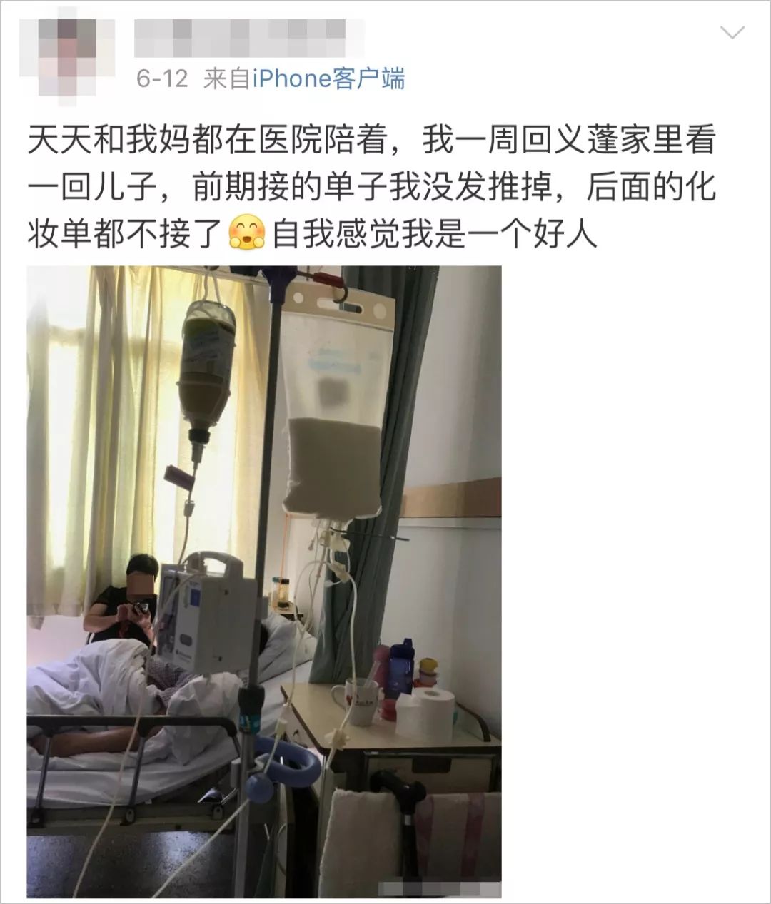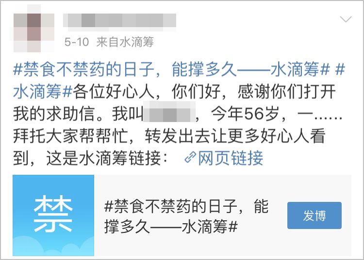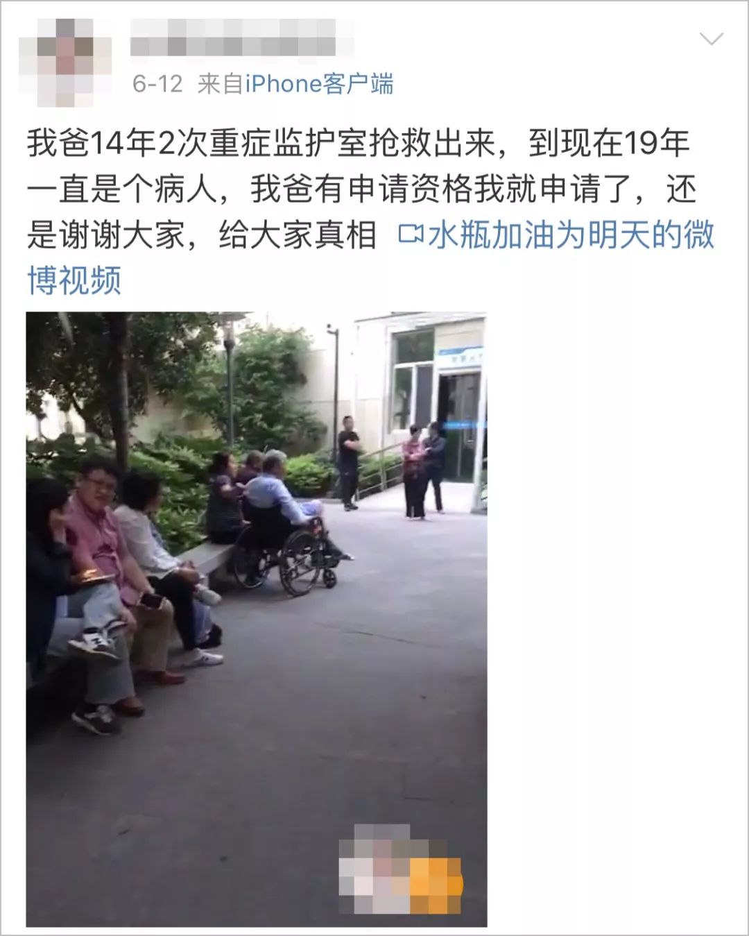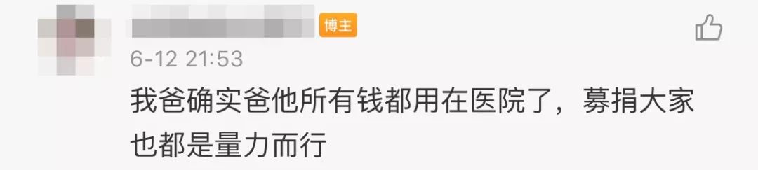 得知自己被曝光后,6月12日,姑娘发了条微博说,她的父亲在2014年接受抢救,直到目前一直是个病人,并提到父亲有资格申请水滴筹救助。