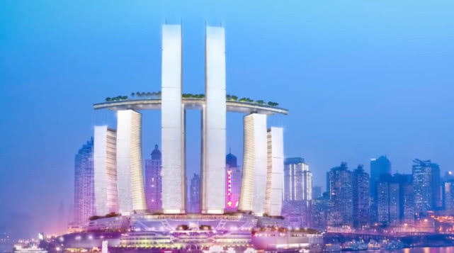 重庆横向摩天大楼,其实并不是人类史上第一座横向摩天大楼,相信不少观众都知道新加坡滨一家酒店的主体建筑,便是由三座大楼加上一座连廊连接起来的结构布局,事实上,这两座横向摩天大楼,也正是同一个以色列设计师,以及同一家新加坡公司投资建设的。