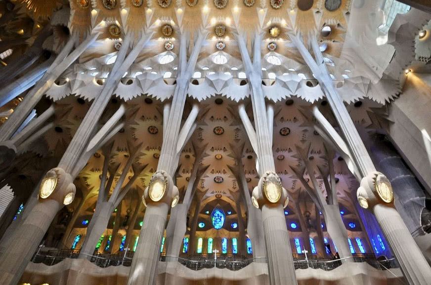 教堂内部更是别有洞天,在这里你更可感觉到圣家族大教堂建筑风格的前卫,这是一个以“自然”为主题元素的大教堂,步入其中仿佛进入了一片茂盛的热带雨林:形似棕榈树的石柱拔地而起,柱子上雕刻了如树干一般的关节,树顶的“叶子”和“花朵”缀满了天花板,阳光透过形状各异的彩色的琉璃窗洒下,投影在地面上斑驳陆离,整个教堂变幻着奇特的光芒,让人惊叹不已。