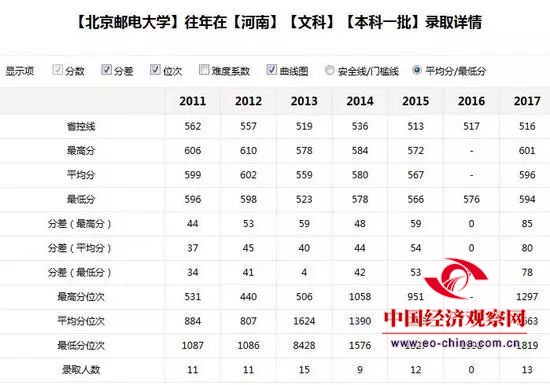 除此之外,往年高校录取情况也是很好的参考。在新浪高考志愿通卡“高校历年分数线”中输入考生的目标院校等基本信息,可以查询到北京邮电大学往年在河南文科一批的录取情况,其中2017年录取平均分为596分,录取平均分位次为1663名(如下图)。