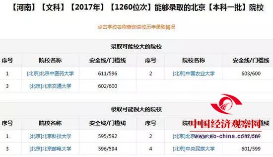 举个例子:2018年高考河南文科考生A同学,查到自己的位次是1260名,目标院校所在地为北京。通过新浪高考志愿通卡根据分数/位次选学校,查询到2017年河南文科排名1260的考生,能够被北京本科一批院校录取可能性较大的有3所,分别是北京中医药大学、中国农业大学、北京交通大学;录取可能性很大的分别是北京科技大学、北京林业大学、北京邮电大学以及中央民族大学4所(如下图)。