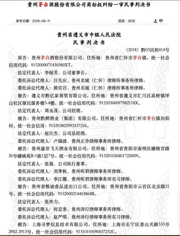 判决书显示,贵州茅台酒公司发现被告遵义黔亿家公司、贵州黔醉酒业公司未经许可,在被告上海寻梦信息公司开办的“拼多多”购物网上,通过名为“酱酒先生”的店铺大量销售“茅台贵宾酒”、“飞天接待酒”、“茅台内供酒”,该三款产品与原告生产的“贵州茅台酒”的包装装潢相近似,并非法使用了茅台公司取得使用权的“飞天”“MAOTAI”等多个知名的茅台商标,构成了严重的商标侵权和不正当竞争行为,侵犯了贵州茅台酒公司的合法权益,严重影响了“茅台”的品牌、品质形象,给贵州茅台酒公司造成巨大损失。