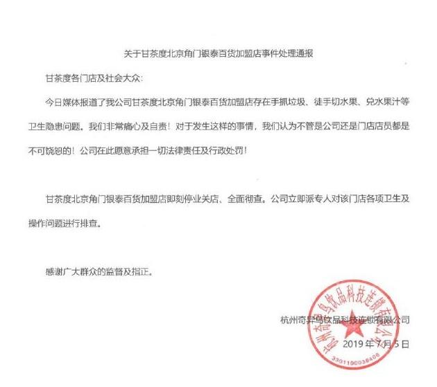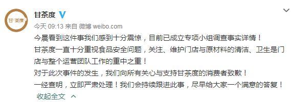甘茶度官方微博发文表示“震惊”,并称已成立专项小组调查事实详情,一经查明立即严肃处理。“甘茶度一直十分重视食品安全问题,关注、维护门店与原材料的清洁、卫生是门店与整个运营团队工作的重中之重,对于此次事件的发生,我们向所有关心与支持甘茶度的消费者致歉。”