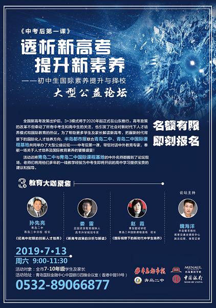 全国新高考政策出炉后,3+3模式将于2020年起正式在山东推行。高考政策的改革不但牵动了所有中考生和高中生的关注,也引发了社会对新时代下人才培养模式和国际教育的热议。为了帮助更多学生及家长解读新高考,把握新时代背景下的国际化人才培养方向,半岛都市报联合青岛二中、青岛二中国际课程基地共同举办了大型公益论坛——中考后第一课,带您对话中外教育专家,奉献一场关于人才培养及国际教育素养的饕餮盛宴!