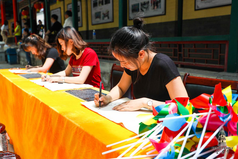 云居寺珍藏的房山石经中的文字雕刻端庄秀丽,荟萃了十一位书法家之大成,有欧阳询、柳公权等著名书法家的风格,是我国书法艺术发展史的一个缩影。此次活动特别在大悲殿菩提树下设置抄经处,游客可以参与抄写经书,能够将完整心经抄写完成者,可到工作人员处领取小礼品一份。