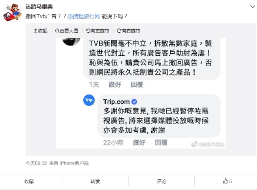 “感谢您的反馈。Trip.com的香港电视广告投放已于6月底正常结束。我们致力为旅客提供优质的旅游产品和服务,感谢用户和社会各界的关心。”