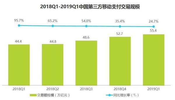 数据显示,2019年第一季度,中国第三方移动支付平台的交易规模为55.4万亿元,同比增长达24.7%,但相对于与去年第一季同比增速的95.7%,今年同期明显减缓。艾瑞咨询表示,这意味着用户对移动支付的已形成习惯和认可,以及移动支付场景的覆盖率不断提高,整个第三方支付的快速增长期已快结束,市场的饱和度极高,目前正进入一个稳步增长的阶段。
