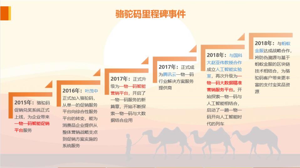 2019年起,骆驼码与蚂蚁金服等达成战略合作,打通大数据的同时接入蚂蚁金服区块链金融科技能力,为消费者带来更丰富的奖品资源。