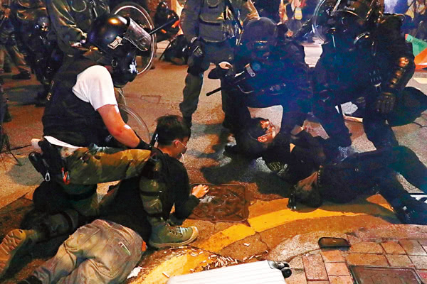 暴徒在大街小巷四处纵火,更自制“火焰冲车”撞向警队防线。暴徒武力再升级,配备弓箭、燃烧弹等高杀伤力武器,又在小巷暗处以丫叉向警员发射玻璃弹珠,并从高处掷砖块、路牌等“空袭”警员。