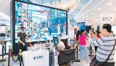 中国电信为消费者提供5G应用场景。上海市民正在商场内体验5G手机的高速网络和5G+8K云VR以及云游戏。 (王冈/人民图片)