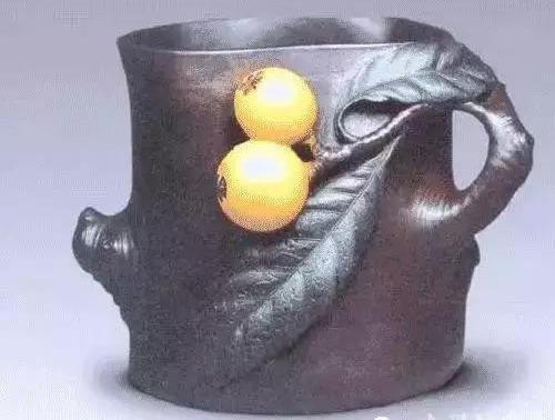 枇杷笔架,是蒋蓉像真文房雅玩举重若轻的名作——状如连枝带叶刚采摘下来的两只枇杷果,墨绿色的枇杷叶上,筋脉毕现,连结着一根褐色的短拙的果柄,附着两只鲜黄可人的枇杷,表皮饱满富有生命的光泽。整个工艺造型,浑然天成,自然雅趣,无人为雕凿之态。