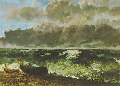 值得一提的是,因为对大海、尤其是汹涌海浪的着迷,库尔贝在同一个角度画了很多幅,不自觉出现“海景画”系列的概念——同一地点、不同时间和光线下的样子,这可比莫奈、毕沙罗们要早得多。库尔贝为了画这些海景画,还研究出一个技法上的发明——用餐刀做画笔,一层一层“刮”出汹涌的海浪,所以在视觉动感上非常强烈。后来,保罗·塞尚对库尔贝的海景画作如是评价:“他笔下的潮汐与海浪,他的雨后清新的树叶和长满苔藓的石头……是时代的最强音。”塞尚抑制不住对库尔贝的溢美之词是有道理的,因为塞尚和库尔贝一样都是对风景自然本身的质感着迷,并且在画面构图和技法上追求创新的身体力行者。1860年代,塞尚也拿起餐刀作画,汲取了库尔贝深层暗淡的色彩以及块面厚涂法。