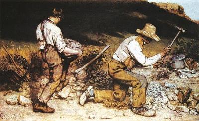 库尔贝这一方面的代表作,尤以《采石工人》《画室》最为经典。1849年的《采石工人》原作已在二战期间被毁。这幅画也是库尔贝比较少表现的题材,据说好似他行走路上的亲眼目睹,然后他并没有当场对景写生也没有回到画室凭想象落笔,据说他是邀请两个工人到画室来做模特儿然后再进行创作的。后来,库尔贝在致友人的一封信中提到此画时所说那样:“在这样悲惨的生活中,这就是他们的一切啊!……看吧,贫困和不幸就是这样无遗留地表现出来了。”库尔贝这种如实地再现法国平民悲惨生活的画面引起了强烈的社会反应。