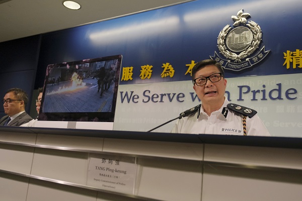 香港特区政府警务处副处长邓炳强展示11日晚暴徒投掷汽油弹的现场画面。新华社记者 王申 摄